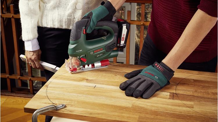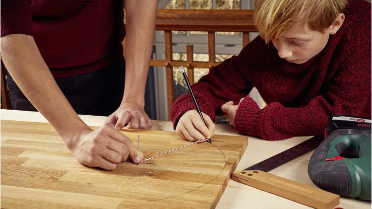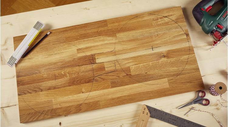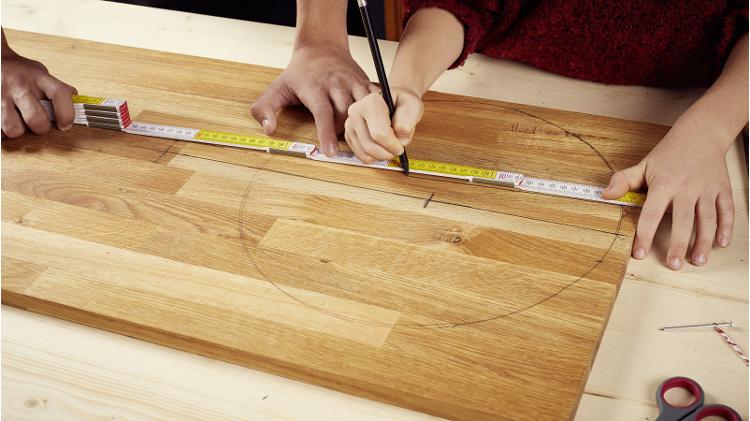 Für den Griff des Brettes misst Du zunächst die Grifflänge von 10 cm vom Rand des Kreises und markierst die Stelle. Damit Dein Griff mittig sitzt, ziehst Du eine Linie vom Mittelpunkt des Kreises bis zur Markierung für den Griff. Achte darauf, dass der Griff in Richtung der Maserung des Holzes verläuft, da dies diesen stabiler macht.