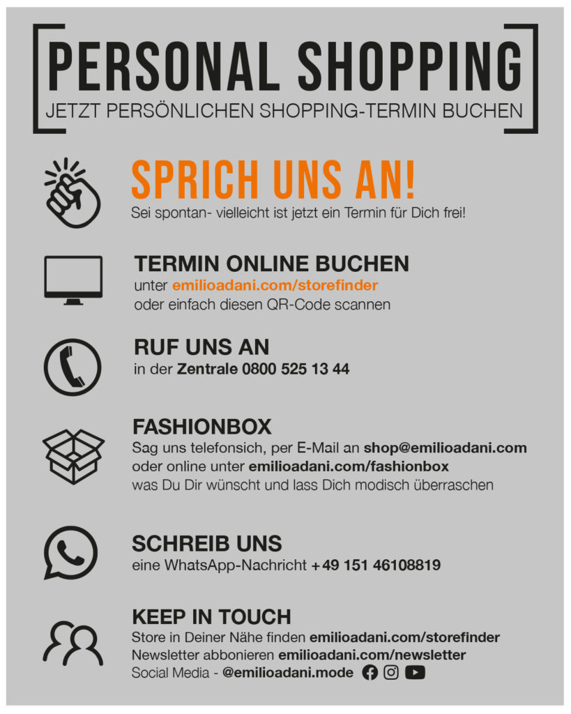Gemeinsam bringen wir wieder Leben in die Stores! Ab sofort dürfen wir Shopping-Termine inkl. persönlicher Beratung in deinen engbers- und emilioadani Stores anbieten.