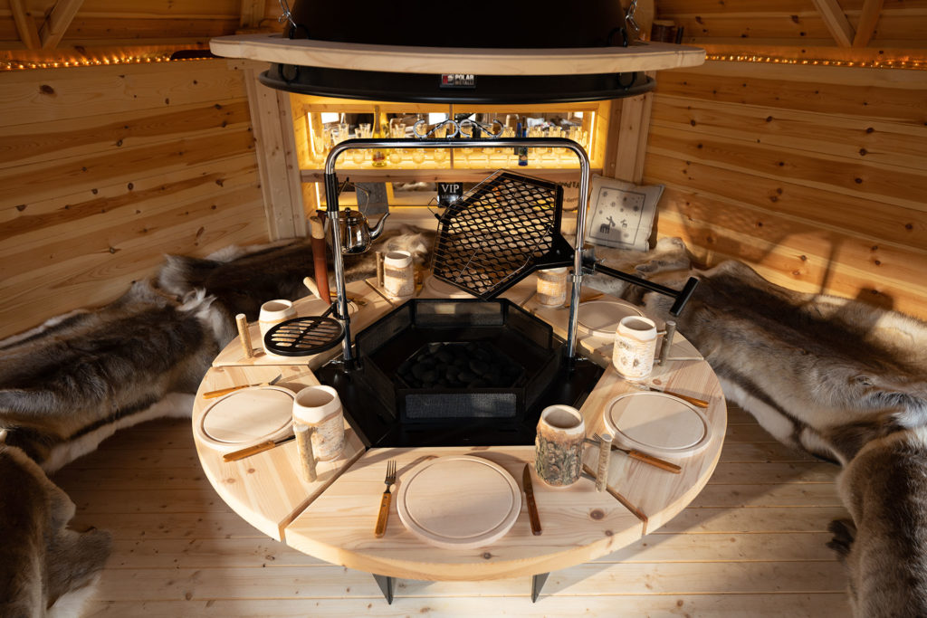Diese Kota ist der Allrounder unter den Grillhütten. Das kanadische Kiefernholz umringt in sechseckiger Bauweise einen mittigen Grill mit vielen Extras wie einem Drehspieß, einem Lachsflammbrett oder Grillpfannen. Die höhenverstellbare Abzugshaube und traditionelle Ausstellfenster sorgen für optimale Luftverhältnisse.