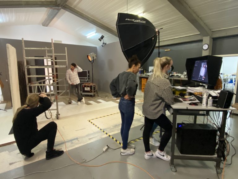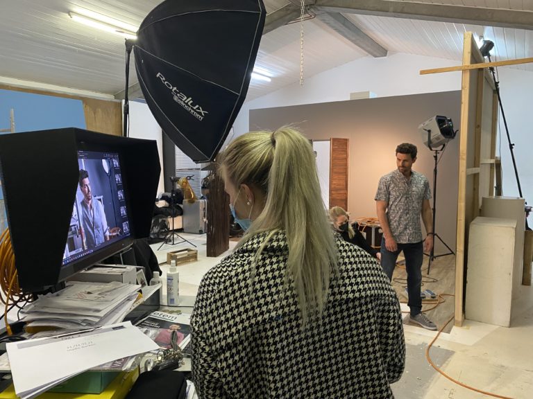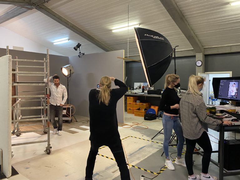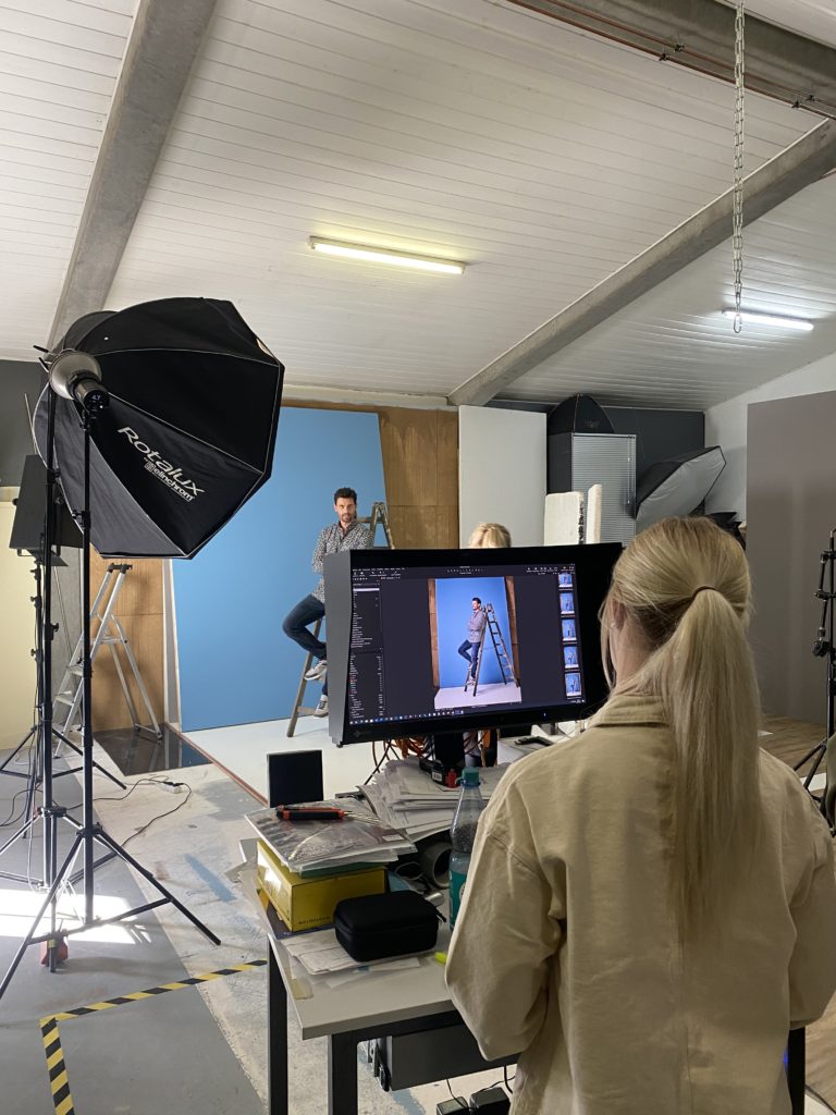 Gestartet wird der Tag mit einem kurzen Einblick in die Ergebnisse des Vortages – wo kann noch angepasst/optimiert werden? Nach kurzer Abstimmung wird das Model gestylt und das erste Set aufgebaut. Am Mittwoch werden dezentere Hintergründe verwendet, um die Outfits zu shooten, die eher eine Atmosphäre für gepflegtere Looks schafft. Auch hier werden wieder um die 6 Outfits am Tag fotografiert. Nach dem Shootingtag wird das Set abgebaut und das Studio aufgeräumt.